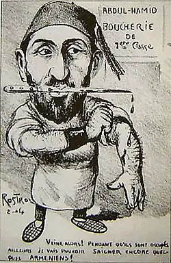 Sultão Abdulamide II descrito nesta caricatura como o carniceiro dos armênios