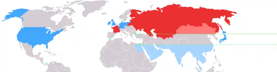 George F. Kennan, embaixador dos EUA na União Soviética, expôs a geoestratégia seminal da Guerra Fria em seu Long Telegram e The Sources of Soviet Conduct. Ele cunhou o termo "contenção",[37] que se tornaria a ideia norteadora da grande estratégia dos Estados Unidos nos próximos quarenta anos, embora o termo viesse a significar algo significativamente diferente da formulação original de Kennan.[38]