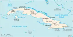 Banhada a norte pelo estreito da Flórida e pelo oceano Atlântico Norte, a noroeste pelo golfo do México, a oeste pelo canal do Iucatão, a sul pelo mar das Caraíbas e a leste pela passagem de Barlavento. A república compreende toda a ilha, incluindo muitas ilhas próximas como a ilha da Juventude, com a exceção da baía de Guantanamo, uma base naval que está ocupada pelos Estados Unidos desde 1903. A ilha principal de Cuba é a 17.ª maior ilha do mundo.[2]