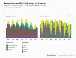 - Energia renovável variável de "economia de combustível", que tem custos variáveis próximos de zero e custos de combustível zero usando energia eólica, solar e hidrelétrica a fio d'água. Com grande parte dessas fontes, "as necessidades de capacidade são impulsionadas por períodos com baixa disponibilidade de VRE" e, portanto, seu papel proposto é substituir outras fontes de alto custo variável nos períodos em que estiverem disponíveis.