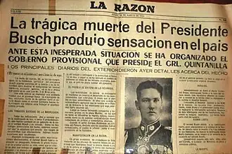 No hospital, havia poucos presentes além de sua própria família e da do vice-presidente Baldivieso.[71] Antes mesmo de Busch falecer, mas já prevendo que sua recuperação era improvável, o general Carlos Quintanilla organizou uma ocupação militar do Palácio Quemado, declarando a sucessão constitucional nula devido à instauração do regime ditatorial por Busch em abril.[71] Após a morte do presidente, os setores mais conservadores e pró-oligarquia da elite boliviana foram rápidos em se reafirmar. Em um pronunciamento radiofônico à nação, Quintanilla declarou-se presidente provisório, encarregado de convocar novas eleições e restaurar o campo político ao status quo tradicional pré-Toro.[71]
