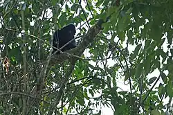O gibão-de-topete (Nomascus concolor) é um símio antropóide encontrado nas florestas subequatoriais da Índia, China, Indochina e Arquipélago Malaio.[3][6] Com seus braços longos, ele se balança de árvore em árvore com grande agilidade, usando as mãos como ganchos, em vez de agarrar os ramos. O gibão é o único símio antropóide a andar somente com os membros traseiros, geralmente levantando os braços para ter equilíbrio. Os gibões comem folhas, frutas, pedaços de flores, insetos, aranhas, pássaros e ovos de aves.[carece de fontes] Geralmente, eles são silenciosos durante o dia, mas uivam ao nascer do sol e no final da tarde. As populações de gibões selvagens foram seriamente reduzidas devido à caça e ao desmatamento.[carece de fontes]