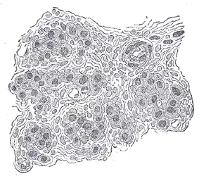 Seção de parte do corpo carotídeo humano. Altamente ampliado. Numerosos vasos sanguíneos são vistos na seção entre as células.