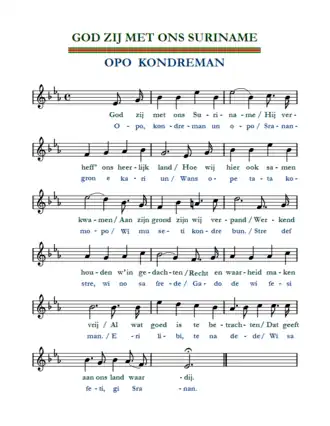| Letra | Cornelis Atses Hoekstra (God zij met ons Suriname), 1898 Henri Frans de Ziel (Opo Kondreman), 1959 |