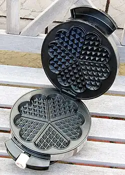 É composta por duas placas de metal com uma dobradiça para conectá-las, as placas são moldadas para criar o padrão de favo de mel encontrado em waffles. Aquece-se o aparelho e despeja-se a massa ou coloca-se a massa entre as placas, que depois se fecham para assar iguarias com um sabor adocicado, muito semelhante às panquecas, mas mais leve e doce. A aparência é muito mais difícil de conseguir do que uma panqueca; daí a máquina de waffles.[1]