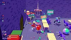 Cada uma das masmorras é gerada aleatoriamente, com salas e inimigos em locais diferentes a cada vez. O jogador pode encontrar itens em cada sala para usar como armas.[3] Cada arma possui um ataque leve e um ataque pesado, e pode ser arremessada. Após um certo número de acertos, a arma se quebra. O jogador pode armazenar três armas simultaneamente e alternar entre elas à vontade. O jogador encontra habilidades ao longo do nível, como causar o dobro de dano no início de uma partida. Se o jogador subir de nível em uma habilidade, ele pode "fixá-la", tornando-a o jogador com ela por padrão.[4] O jogador também pode encontrar aplicativos que dão a Jackie uma habilidade de uso único, como um aplicativo de câmera que atordoa os inimigos com um flash. O jogador recebe dinheiro ao derrotar inimigos, que pode ser gasto em lojas que aparecem em cada andar. As lojas contêm itens de saúde, armas e novas habilidades para adquirir. No final de cada andar, há uma sala de chefes, onde o jogador precisa lutar contra inimigos para avançar para o próximo andar. No quarto andar da masmorra, há um chefe contra o qual o jogador precisa lutar para obter a relíquia. O jogador é enviado de volta ao centro se sua saúde chegar a zero.