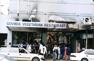 As ruínas incendiadas do Restaurante Govinda em Suva: mais de 100 lojas e empresas foram saqueadas no distrito central de negócios de Suva em 19 de maio. | |||