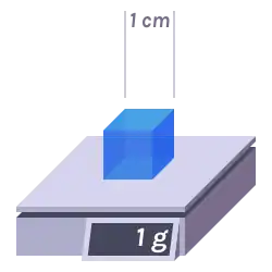 A densidade da água é aproximadamente 1 g/cm3, já que o grama foi originalmente definido como a massa de um centímetro cúbico de água em sua densidade máxima, aproximadamente a 4 °C (39 °F).[1]