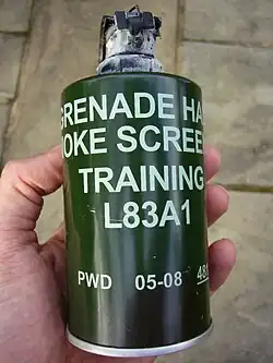 Granada de fumaça britânica L83A1, fabricada em maio de 2008. Esta granada já foi utilizada.
