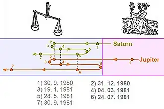 | 19 de fevereiro de 1981 | 7 h 12 min 10s UTC | Júpiter | 1°09' Sul de Saturno | 141,2° Oeste |
