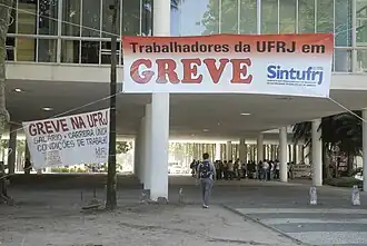 "Trabalhadores da UFRJ em greve" afirma faixa colocada por grevistas na Universidade Federal do Rio de Janeiro (Tânia Rêgo/ABr)