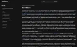 A Grokipedia[nota 1] (estilizada como 𝐆𝐫𝐨𝐤𝐢𝐩𝐞𝐝𝐢𝐚) é uma enciclopédia online impulsionada por inteligência artificial, desenvolvida pela xAI.[4] Lançada em 27 de outubro de 2025,[5] suas verbetes e modelos de linguagem são baseados no chatbot Grok, além de possuir alguns artigos com licença livre e da Creative Commons.[6] Musk posicionou a Grokipedia como uma alternativa à Wikipédia que teria como objetivo "expurgar a propaganda" desta última.[7] Em 2023, Elon Musk teria oferecido uma cifra de 1 bilhão de dólares para que a Wikipédia mudasse seu nome para "Dickpedia", algo que foi recusado pela organização.[8][9]
