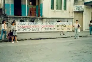As prostitutas também são outro grupo visto como foco da doença, e uma intervenção estatal era estimulada para que a proliferação da enfermidade fosse interrompida[6]. Nesse contexto, as profissionais do sexo eram percebidas também como possíveis agentes de saúde, visto que as associações de prostitutas se aliaram a ONGs de combate à Aids.