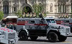 - ↑ a b "Росгвардия получила новый робототехнический комплекс для поиска взрывных устройств – Еженедельник "Военно-промышленный курьер"". vpk-news.ru. Retrieved 1 April 2017. "ЦАМТО / Новости / "Вертолеты России" передали Росгвардии первый вертолет Ка-226Т". armstrade.org. "ЦАМТО / Новости / Росгвардия подписала контракты на поставку снайперского комплекса "Точность"". armstrade.org. "SPM-3 Medved 4x4 Armoured Vehicle – Army Technology". www.army-technology.com. "ЦАМТО / Новости / Минобороны готовит техзадание на военную версию бронеавтомобиля "Медведь"". armstrade.org. Trevithick, Joseph. "Russian Commandos Debut Arctic Combat Buggy That Looks Right Out Of Fast And Furious". The Drive. Frahan, Alain Henry de (14 July 2013). "Russia: Rosgvardiya adopts Tor protective helmet – October 2018 Global Defense Security army news industry – Archive News year". Defense Security global news industry army 2018. Retrieved 27 November 2020. "Janes | Latest defence and security news". Janes.com. "Russia's National Guard to use vans with sonic blasters in war on terror". TASS. Frahan, Alain Henry de (14 July 2013). "Russian National Guard modernizes firearm, vehicle and boat inventory – March 2019 Global Defense Security army news industry – Archive News year". Defense Security global news industry army 2019. Retrieved 27 November 2020. "ЦАМТО / Новости / "Росэлектроника" представила на "Армии-2019" новую боевую разведывательную машину". armstrade.org. "ЦАМТО / Новости / Росэлектроника поставила Росгвардии современный комплекс связи на базе КАМАЗ". armstrade.org. "ЦАМТО / Новости / "Росэлектроника" поставила Росгвардии партию командно-штабных машин". armstrade.org. "Первый "Грачонок" передан Росгвардии". 15 November 2019. "Anti-saboteur boats – Project 21980". "Crimean Bridge protected from air, land and water — National Guard chief". "ЦАМТО / / Росгвардия показала новых роботов для работ по разминированию".