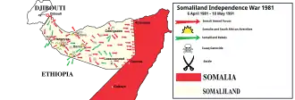 A Guerra da Independência da Somalilândia[26] (somali: Dagaalkii Xoreynta Soomaaliland) foi uma rebelião travada pelo Movimento Nacional Somali contra a junta militar governante no norte da Somália que era liderada pelo General Siad Barre que durou desde a sua fundação em 6 de abril de 1981 e terminou em 18 de maio de 1991, quando o Movimento Nacional Somali proclamou o que constituiria então o norte da Somália independente como República da Somalilândia. O conflito serviu como o teatro principal da mais ampla Rebelião Somali que começou em 1978. O conflito ocorreu em resposta às duras políticas decretadas pelo regime de Barre contra o principal clã familiar no norte da Somália, os Isaaq, incluindo uma declaração de guerra econômica.[27] Essas políticas severas entraram em vigor logo após a conclusão da desastrosa Guerra de Ogaden em 1978.