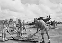 Prisioneiros de guerra japoneses sob supervisão britânica reparando a pista de táxi no campo de aviação de Saigon. Atrás deles está uma aeronave RAF De Havilland DH.98 Mosquito, dezembro de 1945