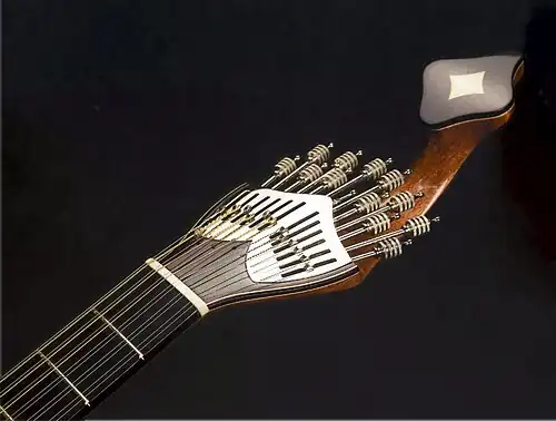 As principais diferenças: caixa de ressonância de maiores dimensões; braço mais longo rematado pela típica voluta; a escala de maiores dimensões, ressaltando sobre o tampo harmónico é dividida cromaticamente por 23 trastes (trastos ou pontos) de metal - 14 colocados até à junção do corpo do instrumento (no modelo da guitarra actual são só 10), sendo os restantes 9 já incrustados na parte da escala que ressalta sobre o tampo harmónico. A forma da caixa tem um recorte em pêra.