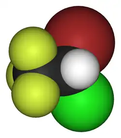 O halotano é um agente anestésico volátil halogenado líquido, da família dos haloalcanos, utilizado para a indução e manutenção da anestesia geral.[2] Um dos seus benefícios está no controlo do aumento de produção de saliva, podendo ser particularmente útil para doentes difíceis de ventilar ou intubar.[2] O halotano é administrado por inalação.[2] Não causa irritação, é bem tolerado e é um potente hipnótico.[1]