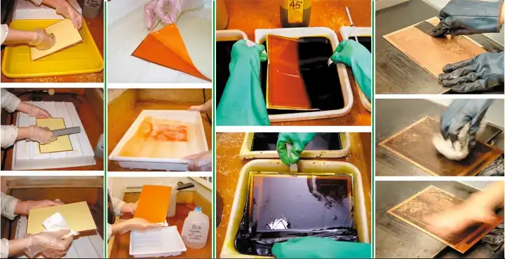 - Depois de aderido, o quinto passo é usar um banho de água quente para remover o papel de suporte e lavar a gelatina mais macia e não exposta. A profundidade restante da gelatina endurecida é relativa à exposição. Essa camada de gelatina endurecida forma uma resistência contornada na placa de cobre. A resina é seca e as bordas e a parte de trás do cobre são finalizadas (encenadas).