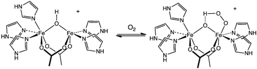 A captação de O2 pela hemeritrina é acompanhada pela oxidação de dois eletrões do centro diferferroso para produzir um complexo hidroperóxido (OOH-). A ligação de O2 é geralmente descrita neste diagrama: