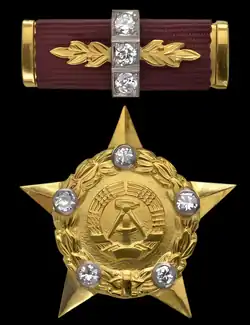 Seguindo o exemplo do título honorário soviético de Herói da União Soviética, o título de Herói da RDA incluía a medalha Estrela de Ouro, um certificado e um prêmio monetário e, a partir de 1978, o prêmio obrigatório da Ordem de Karl Marx. Ambas as condecorações deveriam ser devolvidas ao Estado após a morte do premiado.