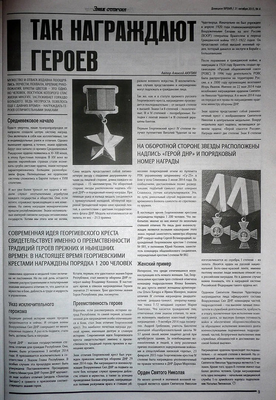 - ↑ Akutin, Ayemor Aleksey (21 de outubro de 2015). «Так награждают героев» [É assim que os heróis são recompensados]. Donetskoye vremya (em russo) (4): 9. Consultado em 2 de setembro de 2025