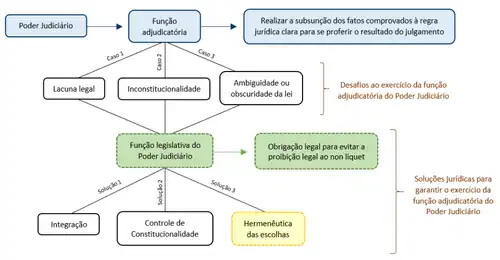 Em um Estado Democrático de Direito, em que o non liquet é vedado, três hipóteses legais ilustram o núcleo de sua atividade judicial. São elas: a preexistência de regras jurídicas claras, a hermenêutica das escolhas e a integração. As hipóteses envolvem a identificação, escolha ou criação da norma jurídica conforme o caso, seguida da aplicação desta regra jurídica ao caso concreto (subsunção) para resolver a controvérsia.[2]