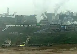 Fábrica com chaminés com vista para o rio Yangtze - Os países estabelecem seus padrões ambientais abaixo dos níveis socialmente eficientes para atrair investimentos ou promover suas exportações.[2]