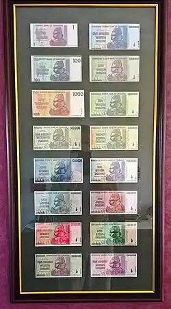Na independência em 1980, o dólar zimbabuano tornou-se a moeda comum. Originalmente, as cédulas eram em denominações de Z$2, 5, 10 e 20, e as moedas em 1, 5, 10, 20, 50 centavos e Z$1. À medida que eram necessárias cédulas maiores para pagar quantias pequenas, o Banco de Reserva do Zimbábue planejou imprimir e colocar em circulação denominações de até Z$10, 20, 50 e 100 trilhões.[65] Anúncios de novas denominações tornaram-se cada vez mais frequentes; a cédula de Z$200000000 foi anunciada poucos dias após a impressão das cédulas de Z$100000000.