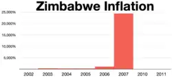 Em 13 de julho de 2007, o governo zimbabuano disse ter interrompido temporariamente a publicação dos números de inflação, medida que observadores afirmaram ter sido feita para desviar a atenção da “inflação descontrolada que passou a simbolizar o colapso econômico sem precedentes do país”.[42][43] Em 2008, a inflação acelerou dramaticamente, de uma taxa em janeiro acima de 100.000%[44] para uma estimativa acima de 1.000.000% em maio,[45][46] e quase 250.000.000% em julho.[47] Como previsto pela teoria quantitativa da moeda, essa hiperinflação foi ligada ao aumento da oferta monetária pelo Banco de Reserva do Zimbábue.[48]