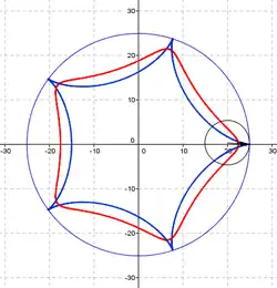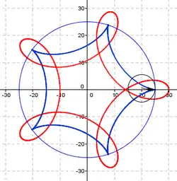 A evoluta de uma hipocicloide é outra hipocicloide, como pode-se observar na figura ao lado.