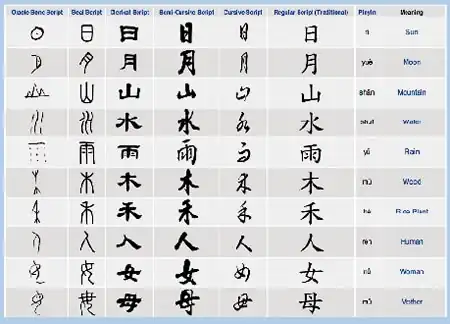 - Os determinativos fonéticos (imagem e som): acrescentados a outros emblemas, podem estabelecer uma ponte semântica ou indicar a presença de radicais comuns. Por exemplo, t'ong ("juntamente") + jin (metal) = "cobre"