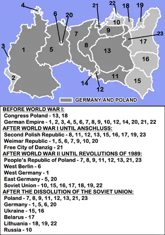 Após a anexação soviética dos territórios Kresy a leste da Linha Curzon, cerca de 2 milhões de polacos foram movidos, transferidos ou expulsos dessas áreas para os novos territórios oeste e norte a leste da linha Oder-Neisse,[15][16] que foram transferidos da Alemanha para a Polónia sob o Acordo de Potsdam.[17] Outros permaneceram no que se tornou a União Soviética e mais foram para a Polónia depois de 1956.[16] O assentamento adicional com pessoas de partes centrais da Polónia elevou o número de polacos no que o governo chamou de Territórios Recuperados para 5 milhões em 1950. A maior parte da antiga população alemã de 10 milhões fugiu ou foi expulsa para a Alemanha do pós-guerra em 1950:[8][18] cerca de 4,4 milhões fugiram nos estágios finais da guerra e 3,5 milhões foram removidos pelas autoridades polonesas em 1945–1949.[19] A expulsão dos alemães foi resultado das decisões aliadas finalizadas em Potsdam.[16][b1]
