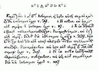 Inicialmente, os gregos usaram a numeração ática, que usava símbolos para os números.[27] Este sistema é descrito em gramáticas pelo historiador Aelius Herodianus, de um rei Herodes, no século II a.C.. Com numeração ática registra-se os resultados dos cálculos no ábaco. Ao longo do tempo, a numeração foi substituído pela alfabética compacta, ou jônica.[28] A numeração jônica usou as 24 letras do alfabeto grego e três letras extras de tratamento às unidades de 1 a 9, dezenas de 10 a 90 e centenas de 100 a 900 (lançadas a partir de cartas de circulação utilizadas para designar números 6, 90, 900 [27]). Para distinguir o número de cartas sobre eles colocavam a linha. Para gravar o número 1000 utilizando o mesmo símbolo para a unidade, mas com um traço na parte inferior esquerda. Esta é uma reminiscência de um sistema posicional, mas a transição final ocorreu.[29] Acredita-se que tal sistema dificultava cálculos complexos,[7] mas em 1882 o historiador da Matemática francês Paul Tannery chegou à conclusão de que a abordagem correta do sistema de numeração grego não é muito diferente dos cálculos decimais mais rápidos.[30]