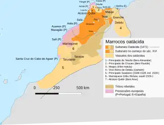 Durante o governo Português (1471-1661), Tânger é a capital do Algarve, em África, porque existem dois Algarves, a da Europa e a de África, tanto um como outro considerados territórios pessoais da Dinastia de Avis e depois da dinastia de Bragança (o rei de Portugal também tinha o título de Rei dos Algarves). Sob os reinados sucessivos de Afonso V, João II e Manuel I (período que marca o apogeu da expansão Portuguesa) o Algarve africano abrange quase toda a costa atlântica de Marrocos , com a excepção de Rebate e Salé. Os Portugueses controlam a parte costeira que se estende desde Ceuta até Agadir (Fortaleza de Santa Cruz do Cabo de Gué), tendo como marcos as praças fortes de Alcácer-Ceguer, Tânger, Arzila, Azamor, Mazagão e Safim e do Castelo Real de Mogador. Estas possessões formam as fronteiras, e são usadas como paradas na rota do Brasil e do Estado Português da Índia. No entanto, a maioria do Marrocos português é conquistada pelos sádidas em 1541. A última fronteira é a de Mazagão, recuperada pelos marroquinos em 1769. Os espanhóis, quanto a eles dominam parte da costa do Mediterrâneo com os presídios de Melilha e o Ilhote de Vélez de la Gomera, assim como a região de Tarfaya em frente das ilhas Canárias. Também conservam o controlo de Ceuta após a Restauração da Independência de Portugal em (1640). Os Oatácidas enfraquecidos, finalmente, cedem o poder a uma dinastia que reivindicava uma origem árabe Xerifiana, os sádidas) em 1554.[35]