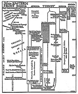 Entretanto, Berlim, ciente da agitação quase revolucionária na Rússia na década anterior, lançou sua própria guerra de propaganda. O Ministério das Relações Exteriores disseminou notícias falsas que tiveram o efeito desejado de desmoralizar os soldados russos.[77] A tática mais bem-sucedida de Berlim foi apoiar revolucionários russos de extrema esquerda dedicados a atacar e derrubar o czar. O Ministério das Relações Exteriores alemão forneceu mais de 50 milhões de marcos de ouro aos bolcheviques e, em 1917, transportou secretamente Lenin e seus principais assessores do exílio na Suíça através da Alemanha para a Rússia. Mais tarde naquele ano, eles derrubaram o regime liberal e começaram sua marcha para controlar toda a Rússia.[78][79][80] Os bolcheviques concentraram grande parte de sua propaganda em prisioneiros de guerra dos exércitos alemão e austríaco. Quando a Rússia saiu da guerra em 1917, esses prisioneiros retornaram para casa e muitos levaram consigo o apoio a ideias revolucionárias que rapidamente influenciaram seus camaradas.[81]