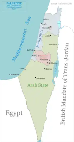 Em 1947, as Nações Unidas criaram o Comité Especial das Nações Unidas sobre a Palestina (CENUSP) para encontrar uma solução imediata à questão da Palestina, que os britânicos tinham entregue à ONU. O relatório indicava que o estado árabe seria forçado a pedir por assistência financeira "de instituições internacionais na forma de empréstimos para expansão da educação, saúde pública e outros serviços sociais vitais de uma natureza não auto-apoiante". Uma nota técnica do secretariado explicava que sem alguma redistribuição de aduaneiros do estado judaico, a Palestina árabe não seria economicamente viável. O comité estava satisfeito que o estado judaico proposto e a Cidade de Jerusalém seriam viáveis.[17] A maioria dos membros do CENUSP propôs certas recomendações para a Assembleia Geral da ONU que a 29 de novembro de 1947 adotou uma resolução recomendando a adoção e implementação do Plano de Partição, baseado substancialmente nessas propostas como a Resolução 181(II). PARTE I: Futura constituição e governo da Palestina: A. Cláusula 3. fornecido como segue:- Estados independentes árabe e judaico e o Regime Internacional Especial para a Cidade de Jerusalém, colocado em marcha na parte III deste plano, deve existir na Palestino dois meses depois da evacuação das forças armadas do Poder mandatório ter sido completa mas em qualquer caso não mais tarde que 1 de outubro de 1948. A resolução observava a terminação planeada da Grã-Bretanha do Mandato britânico da Palestina e recomendava a partição da Palestina em dois estados, um árabe e um judaico, com a área de Jerusalém-Belém estando sob proteção internacional especial, administrada pelas Nações Unidas. A resolução incluía uma descrição altamente detalhada dos limites recomendados para cada estado proposto. A resolução também continha uma plano para uma união económica entre os estados propostos, e um plano para a proteção dos direitos religiosos e de minoria. Esta resolução procurava abordar os objetivos contraditórios e reivindicações ao território do Mandato dos dois movimentos nacionalistas, Sionismo (nacionalismo judaico) e nacionalismo árabe, como também resolver a situação dos judeus desalojados como resultado do Holocausto. A resolução pedia pela retirada das forças britânicas e a terminação do Mandato até 1 de agosto de 1948, e o estabelecimento de novos estados independentes até 1 de outubro de 1948.