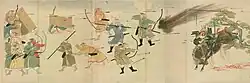A segunda tentativa de invasão teve lugar em 1281.[92] Os samurais efectuaram ataques aos navios inimigos, tais como a pequenas balsas que tinham uma capacidade limitada de transportar cerca de doze guerreiros,[93] isto com o propósito de impedir que as tropas inimigas apeassem na costa. Após uma semana de combates, um emissário imperial foi requerido para solicitar a Amaterasu, a deusa do sol, que intercedesse pelo exército japonês.[92] Um tufão atingiu a frota mongol e a afundou quase por completo. Isso deu origem ao mito do Kamikaze (神風, lit. "Vento Divino"),[90] considerado como um sinal de que o Japão teria sido escolhido pelos deuses e, portanto, estes seriam responsáveis pela sua segurança[94] e sobrevivência das forças japonesas.[95] Os poucos sobreviventes mongóis decidiram aposentar-se, determinando a vitória do Japão.[92]