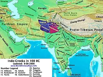 - ↑ Províncias gregas na Índia, de acordo com fontes clássicas: