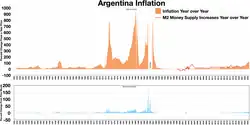 No início da década de 1970, a renda per capita na Argentina era duas vezes maior que a do México e mais de três vezes superior à do Chile e do Brasil. Em 1990, a diferença de renda entre a Argentina e outros países latino-americanos era muito menor.[82] A partir do Rodrigazo [es] em 1975, a inflação acelerou drasticamente, atingindo uma média superior a 300% ao ano de 1975 a 1991, aumentando os preços 20 bilhões de vezes.[82]