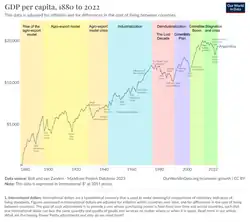 Na década de 1870, os salários reais na Argentina equivaliam a cerca de 76% dos da Grã-Bretanha, subindo para 96% na primeira década do século XX.[62] O PIB per capita passou de 35% da média dos Estados Unidos em 1880 para cerca de 80% em 1905,[63] nível semelhante ao da França, Alemanha e Canadá.[64]
