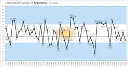 A história econômica da Argentina é uma das mais estudadas devido ao chamado "paradoxo argentino". No início do século XX, o país alcançou um elevado nível de desenvolvimento, mas sofreu um declínio relativo em comparação com outras economias desenvolvidas, o que gerou uma vasta literatura e diversas análises sobre as causas dessa regressão.[2] Desde a independência da Espanha em 1816, a Argentina entrou em default em sua dívida externa nove vezes. A inflação frequentemente atingiu dois dígitos, chegando a picos de 5.000%, resultando em várias desvalorizações monetárias [en] significativas.