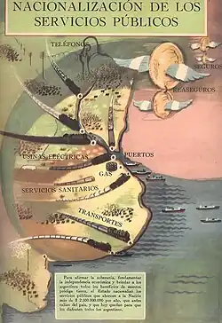 As reservas acumuladas durante a guerra permitiram ao governo peronista quitar totalmente a dívida externa em 1952; ao final do ano, a Argentina tornou-se credora líquida em US$5 bilhões.[106] Entre 1946 e 1948, as ferrovias de propriedade francesa e britânica foram nacionalizadas, e a rede existente foi expandida, alcançando 120.000 quilômetros até 1954.[107] O governo também criou o IAPI para controlar o comércio exterior de commodities de exportação.[108] Perón estabeleceu um sistema de quase total protecionismo contra importações, isolando amplamente a Argentina do mercado internacional.[109] Em 1947, ele anunciou seu primeiro Plano Quinquenal [es], baseado no crescimento de indústrias nacionalizadas.[101] O protecionismo criou uma indústria voltada para o mercado interno, com altos custos de produção e incapaz de competir internacionalmente.[101] Ao mesmo tempo, a produção de carne bovina e grãos, principais produtos de exportação, estagnou.[109] O IAPI passou a pagar menos aos produtores e, quando os preços mundiais de grãos caíram no final da década de 1940, isso sufocou a produção agrícola, as exportações e o sentimento empresarial em geral.[110] Apesar dessas limitações, o protecionismo e os créditos governamentais permitiram um crescimento exponencial do mercado interno: as vendas de rádios aumentaram 600% e as de geladeiras cresceram 218%, entre outros.[111]