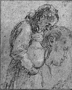 Para este painel conhece-se um desenho preparatório, conservado no Louvre, relativo a toda a composição e geralmente atribuído a Annibale. Este desenho mostra, em relação ao afresco, um menor aglomerado de figuras e também se diferencia por outros detalhes.[30]