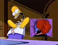 ![]() Homer tendo um ataque cardíaco no escritório do Sr. Burns, enquanto uma visão animada de seu coração é mostrada em uma caixa de inserção. | |||||