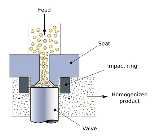 A homogeneização do leite é realizada pela mistura de grandes quantidades de leite colhido e, em seguida, forçando o leite a alta pressão por meio de pequenos orifícios.[7] A homogeneização do leite é uma ferramenta essencial do setor de alimentos lácteos para evitar a criação de vários níveis de sabor e concentração de gordura.