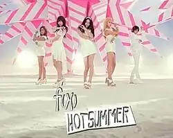 Hot Summer é uma canção do girl group sul-coreano f(x). A canção foi escrita e co-produzida pelos compositores dinamarqueses Remee e Thomas Troelsen para o grupo alemão Monrose, para o seu segundo álbum de estúdio , Strictly Physical de 2007. Em 2011, foi gravada por f(x). A canção foi lançada em 14 de Junho de 2011, na Coreia do Sul, servindo como primeiro single da versão repackaged de seu álbum de estreia, Pinocchio.[16] A versão coreana foi um sucesso comercial, alcançando a posição #2 na parada de single oficial da Gaon, registrando mais de 375 mil downloads durante a sua semana de lançamento. Hot Summer foi o 16° canção digital mais bem-sucedida de 2011, em seu país natal, vendendo 2.909.384 cópias até o final do ano.[17] A canção serviu para a estreia japonesa do f(x) em 2012.[18] Antecedentes"Hot Summer" é uma versão em coreano/japonês da versão original em inglês cantada pelo grupo pop alemão, Monrose. Em 8 de junho de 2011, a SM Entertainment revelou que o grupo voltaria com Hot Summer, a faixa-título do repackage (relançamento) de seu primeiro álbum, "Pinocchio". SM afirma que a "faixa de acompanhamento, ['Hot Summer'], apresenta a única cor que f(x) é conhecido. Por favor, olhe para a frente para uma nova etapa. "A canção foi lançada uma semana depois, em 14 de junho de 2011. Hot Summer serviu para a estréia no Japão do f(x) em agosto de 2012, após a SM Entertainment anunciar que elas estreariam no país no início do ano. O grupo preparou sua estréia japonesa com o lançamento de seu website japonês em junho de 2012. Performances ao vivoHot Summer recebeu a sua primeira performance ao vivo no Music Bank em 17 de junho de 2011. O grupo vestiu as roupas vermelhas que usava na versão coreana do vídeo da música, que se tornou um marco para o resto do período promocional de Hot Smmer. O grupo também se apresentou no M-Countdown. Hot Summer ganhou um prêmio no Inkigayo em 26 de junho. A canção também foi realizada como parte da SMTown '10 e SMTown '12. Vídeo musicalVersão em coreanoA versão coreana do clipe de Hot Summer foi filmado em dois locais diferentes, em Namyangju e Incheon, no início de junho de 2011. Foi dirigido por Hong Won Ki, que havia dirigido o vídeo de "Hello" do Shinee. Um teaser foi lançado em 13 de junho de 2011, a versão completa foi lançado em 17 de junho de 2011, no mesmo dia, o grupo se apresentou no Music Bank.[19] O vídeo começa com o grupo de caminhando no meio da rua, filmado em Incheon, vestindo roupas coloridas, um tanque despojado preto e rosa está por trás delas, juntamente com vários carros esportivos coloridos. Eles são acompanhadas por um grupo de dançarinos. O vídeo mostra elas em uma sala com piso vermelho, onde o grupo está vestindo roupas vermelhas, o mesmo conjunto é usado para filmar as cenas individuais das meninas. Outro conjunto visto é o quarto 'light', onde elas também usam roupas vermelhas, e Luna veste uma peruca vermelha. No final do vídeo, hidrantes estouram, sinalizando o calor do dia, e o vídeo termina com o grupo posando em conjunto na rua com as palavras "Hot Summer f(x)" visto como a câmera se move para cima. Versão em japonêsUm vídeo teaser para a versão japonesa do clipe Hot Summer foi lançado em 1 de agosto de 2012, no canal oficial no YouTube da Avex Trax. Posteriormente, o vídeo completo apareceu on-line, alguns dias depois, em 5 de agosto de 2012. A versão japonesa é visivelmente diferente de sua contraparte coreana. O principal conjunto é um deserto, com adereços em forma de estrela rosa e branco por trás do grupo, e algodão doce rosa como as nuvens. O vídeo começa semelhante à versão coreana, com o grupo usando tudo branco, caminhando lentamente em direção à câmera. Ao contrário dos vídeos anteriores do f(x), tanto a versão japonesa e coreana não têm um verdadeiro enredo. O vídeo, em seguida, corta para outro conjunto, semelhante ao observado video coreano do grupo, Electric Shock, bem como um destaque na versão coreana. Close-up disparos do grupo revelam roupas azuis elétricos, coberto com acessórios elaborados, como os picos no chapéu de Amber. O vídeo termina com o conjunto do deserto, e as palavras "f(x) Hot Summer", assim como a versão coreana, na tela como a câmera se move para trás. Desempenho comercialCoreia do SulA versão coreana foi um sucesso comercial, atingindo o número #2 na Gaon depois de estrear na posição #5, que em seguida, subiu três posições para o seu pico, nº 2, em seguida, caindo para a 4° posição. Foram mais de 375 mil downloads durante a sua semana de lançamento, estreando na posição #3. A canção, em seguida, vendeu mais 536 mil cópias na semana seguinte, depois de vender 428 mil cópias e caindo para o número #4 no gráfico de download digital da Gaon, a canção vendeu mais de 1,3 milhões de cópias em suas primeiras três semanas. Hot Summer também foi classificado em outras gráficos da Gaon, estreando em #14 na parada de singles Karaokê, e atingindo um pico de #2 na semana seguinte. Chegou ao número um na parada de streaming da Gaon, que acompanha internet streaming em sites de música coreanos, como MelOn. Hot Summer foi a 16° canção digital mais bem-sucedida de 2011, em seu país natal, vendendo 2.909.384 cópias até o final do ano. E foi o 25.º canção de maior sucesso global em 2011, 21 posições abaixo de seu single anterior, Pinocchio (Danger), que foi o sexto mais bem-sucedido. Desempenho nas paradasGaon