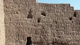 A técnica de construção predominante consiste em colocar os adobes na posição vertical, alinhados com argamassa na base e na parte superior, deixando pequenos espaços vazios nas laterais. Isso dá a ela um aspecto dos livros em uma estante, e é por isso que o estudioso Pedro Villar Córdova o chamou de "técnica do livreiro". Além disso, as paredes são formadas por painéis trapezoidais e têm uma leve inclinação que deixa as paredes com a base mais larga que a parte de cima, ficando assim com um equilíbrio físico e estético. As paredes podem atingir até oito metros de altura (as que definem os lados da grande pirâmide) e as da parte inferior do monumento, em outros locais chegam a quatro metros. [7]