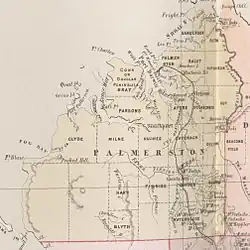 - ↑ Township de Palmerston no lado leste do porto Darwin, Hundred de Bagot