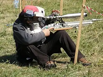Nota: não é permitido atirar na posição sentado em competições oficiais,[6] apesar dessa prática ser bastante aceita entre os praticantes menos formais.[7]